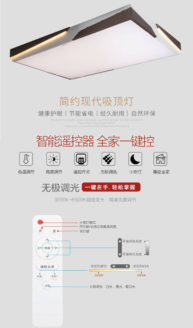 •光源使用加透镜方案,发光角度面积大,更均匀,自然护眼,灯体外置软灯条光源侧发光,带遥控控制。